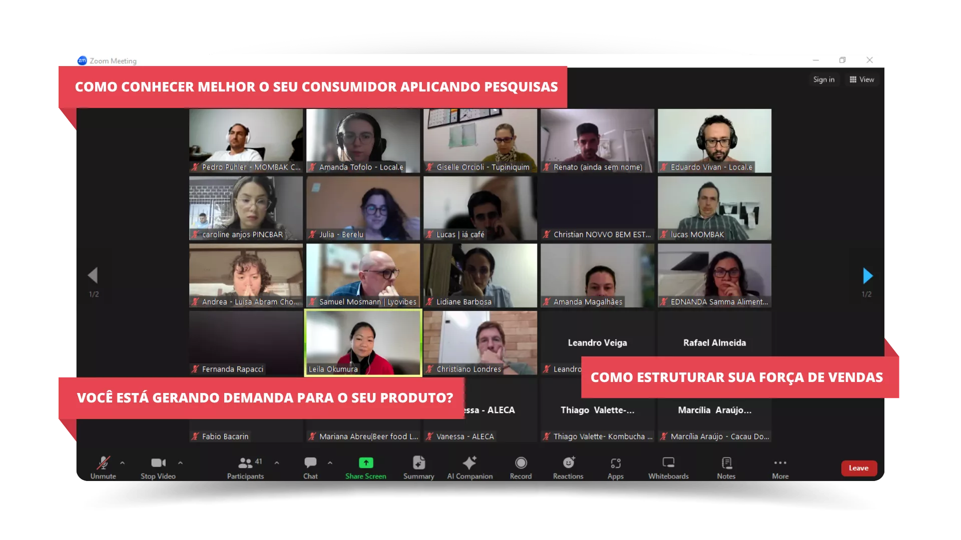 Todos os meses, nos reunimos em uma sessão especial com Leila Okumura em que discutimos temas como posicionamento de marca, estratégia comercial, negociação com o varejo, etc. Nesses encontros, as marcas tem oportunidade de esclarecer dúvidas e compartilhar experiências.